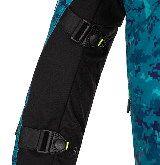 - fixace loketních chráničů a obvodu rukávů pomocí pružných pásků a druků