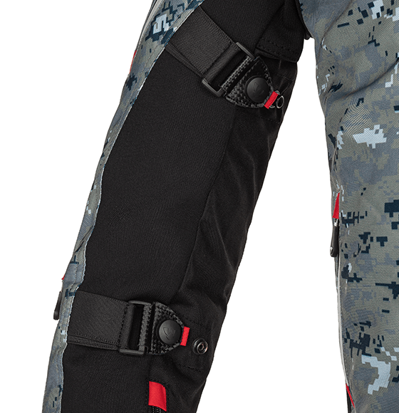 - fixace loketních chráničů a obvodu rukávů pomocí pružných pásků a druků