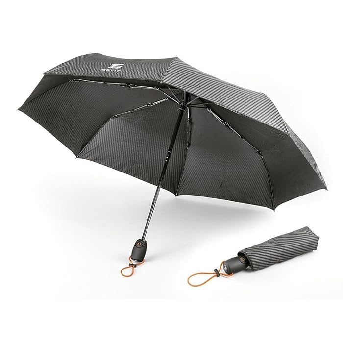Kapesní deštník SEAT spojuje praktičnost se stylem, vyznačuje se velkorysým průměrem 94 cm a odolnou konstrukcí ze 100% polyesteru. Jeho elegantní černo-oranžový design z něj dělá nezbytný doplněk pro moderní profesionály.