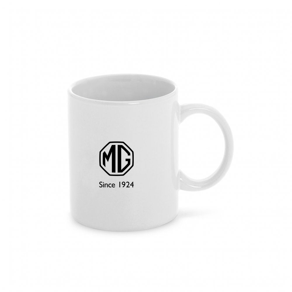 Bílý porcelánový hrnek s logem MG. Vhodný pro teplé nápoje.