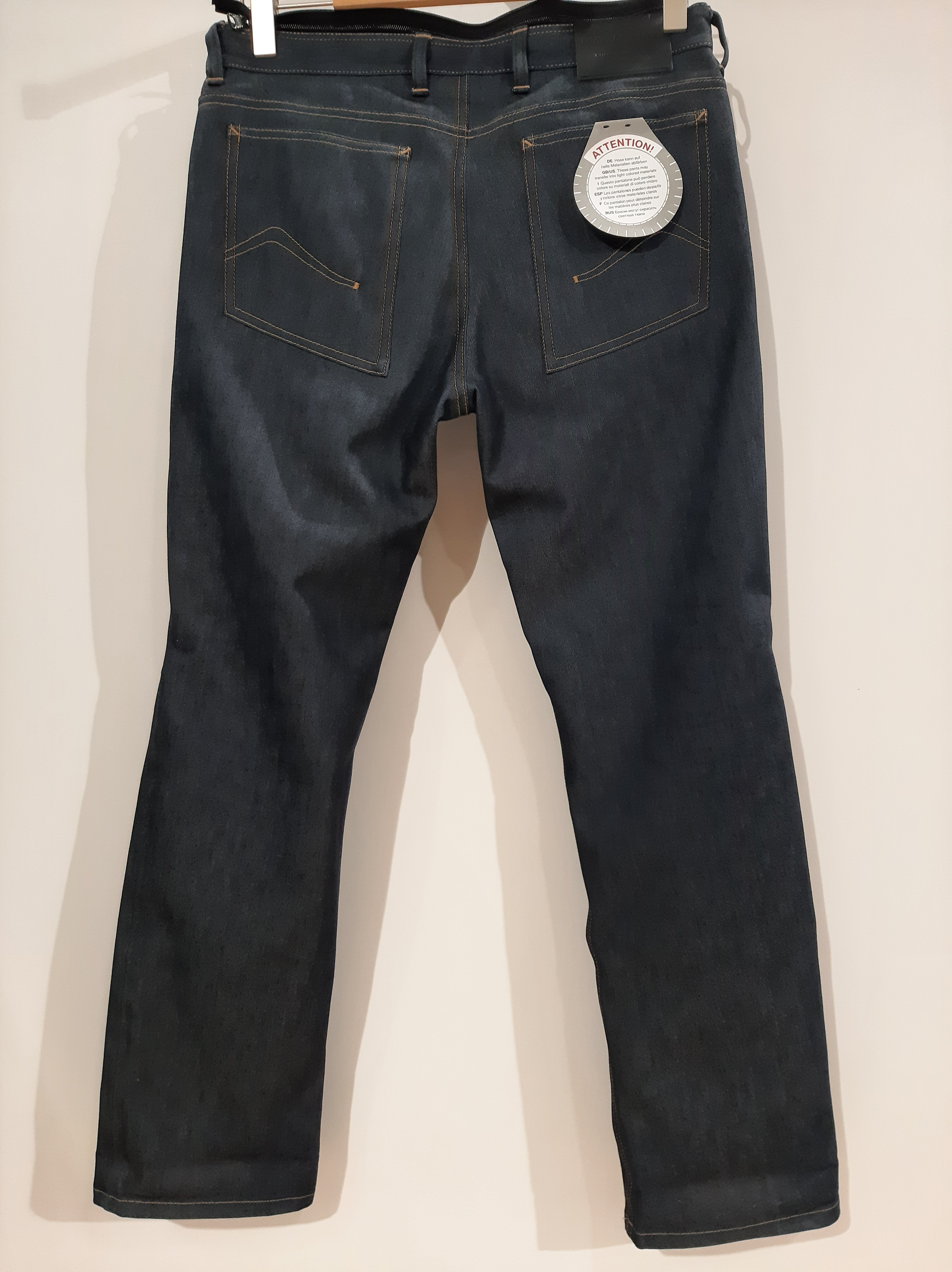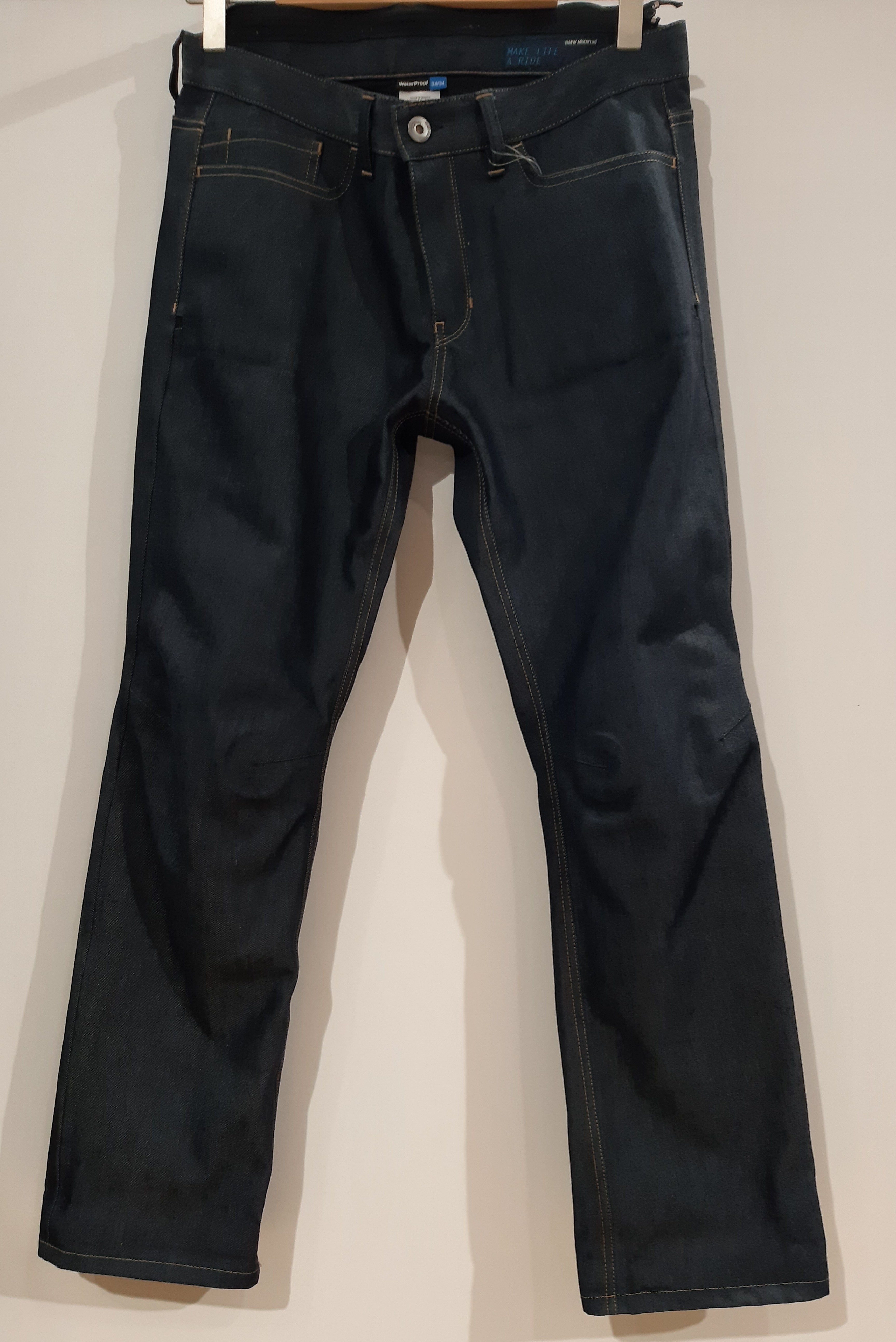 - Nepromokavé motorkářské kalhoty v klasickém džínovém vzhledu s pěti kapsami