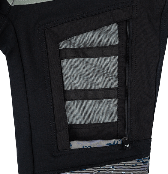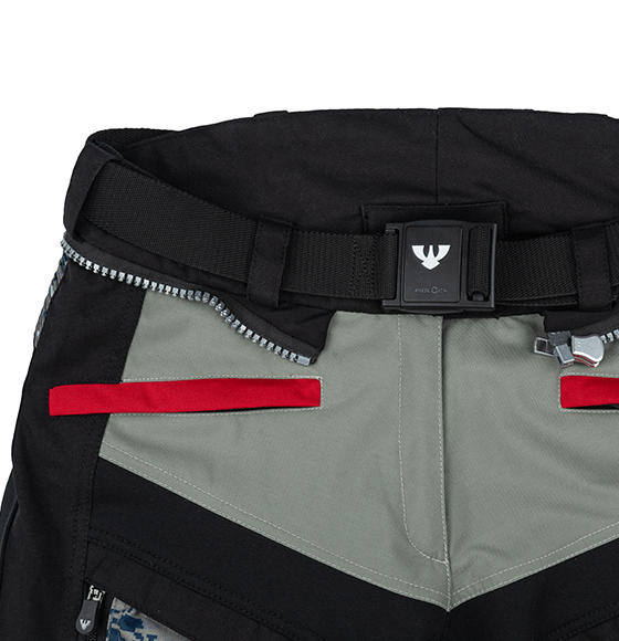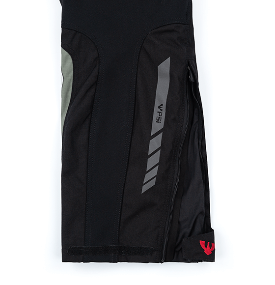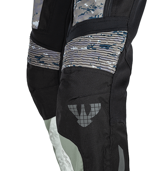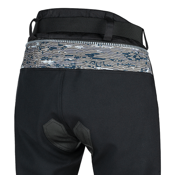 Větrací panely na stehnech zajistí dobré odvětrání v horkých dnech. Nohavice díky dvěma regulujícím zipům můžete vložit jak dovnitř bot, tak nahoru přes ně. Sedací část má protiskluzové prvky. Vnitřní část kalhot je zesílena kůží jako prevence poškození kalhot od rámů motocyklů. Bezpečnost zvýšíte připnutím kalhot dlouhým zipem k bundě.