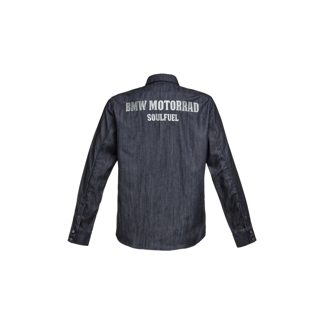 Klasická džínová košile se dvěma náprsními kapsami, límcem, zapínáním na knoflíky a velkým nápisem „BMW Motorrad Soulfuel“ na zádech.