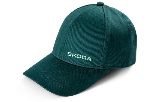 Baseballová čepice v barvě emerald green s vyšívaným logem Škoda. 6 panelů, pásek k regulaci velikosti s kovovou přezkou a logem Škod