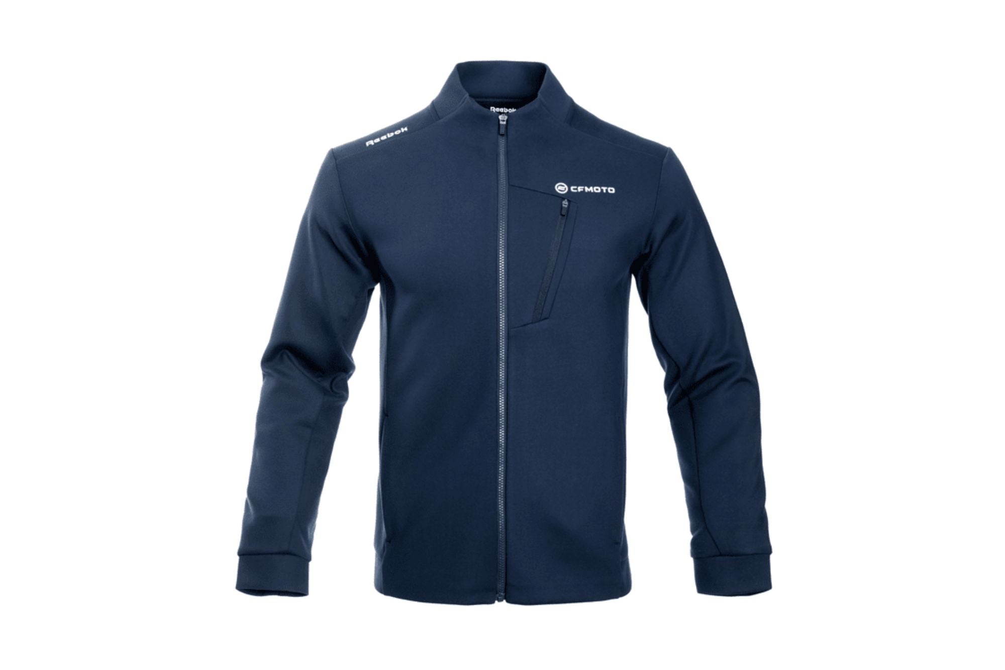 Pánská, tmavě modrá, větruvzdorná značková mikina s vysokým límcem.