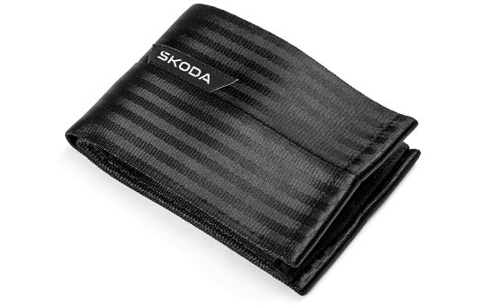 Pánská peněženka vyrobená ručně z recyklovaných autopásů s textilní etiketou s logem Škoda. Materiál je odolný, pevný a omyvatelný. Peněženka je otevíratelná na cvoček. Uvniř má čtyři přihrádky na karty, jednu velkou a druhou menší přihrádku na bankovky a kapsičku na mince na zip.