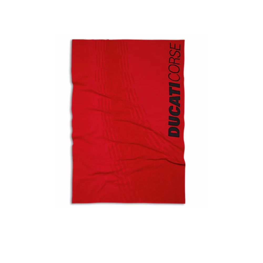 Plážová osuška s ikonickou červenou barvou a nápisem.