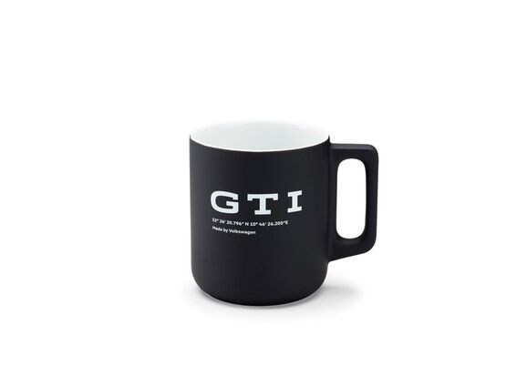 Porcelánový hrnek v matné černé barvě, s natištěným nápisem GTI a souřadnicemi, kde se modely GTI montojí. Objem: 0,36 l.