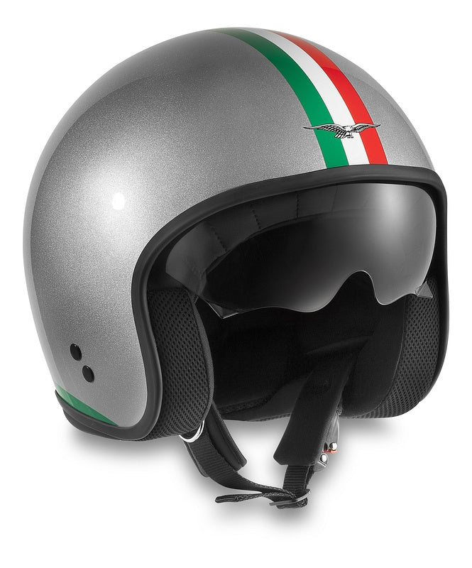 Přilba Jet Moto Guzzi s výsuvnou sluneční clonou.