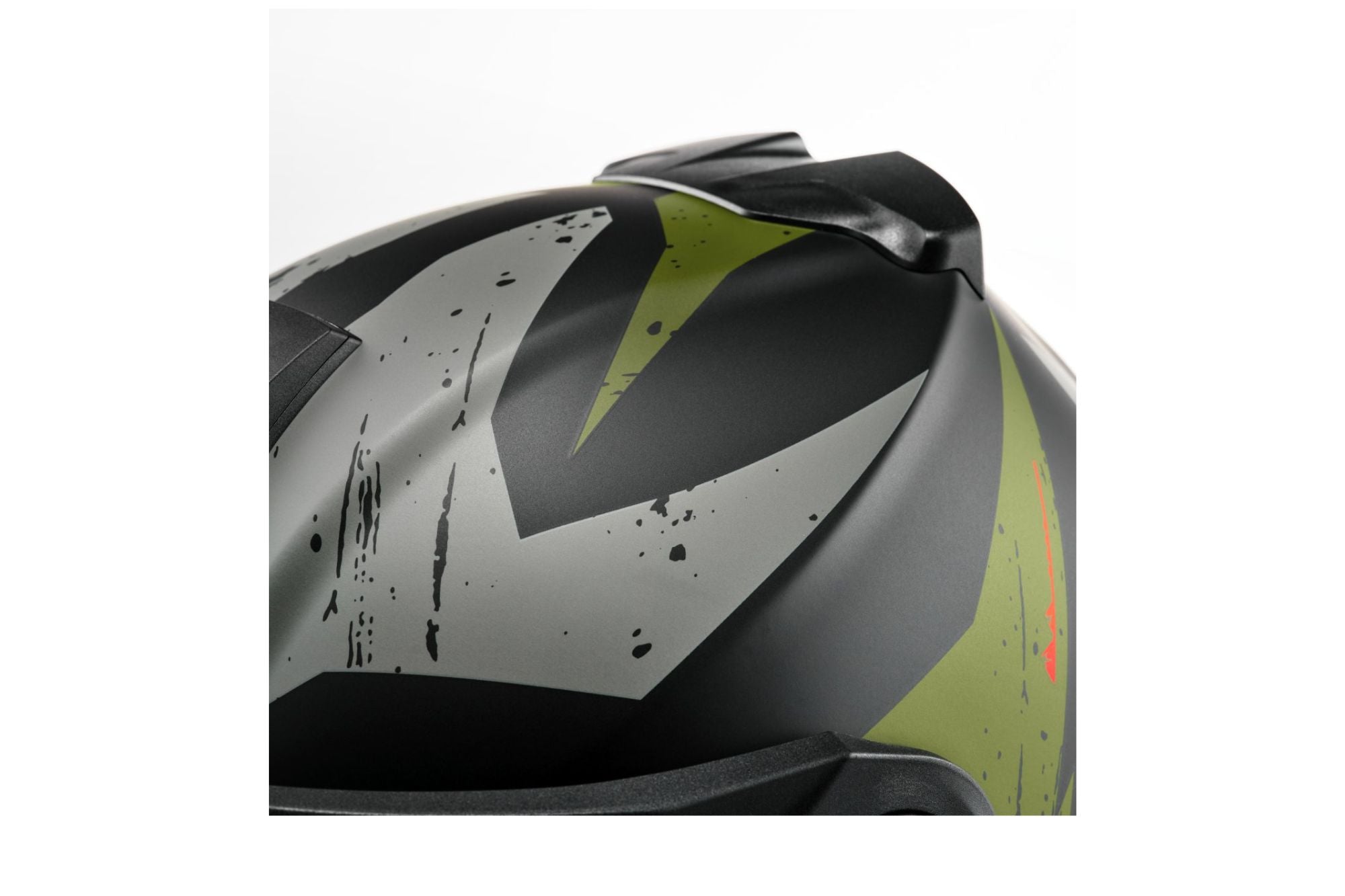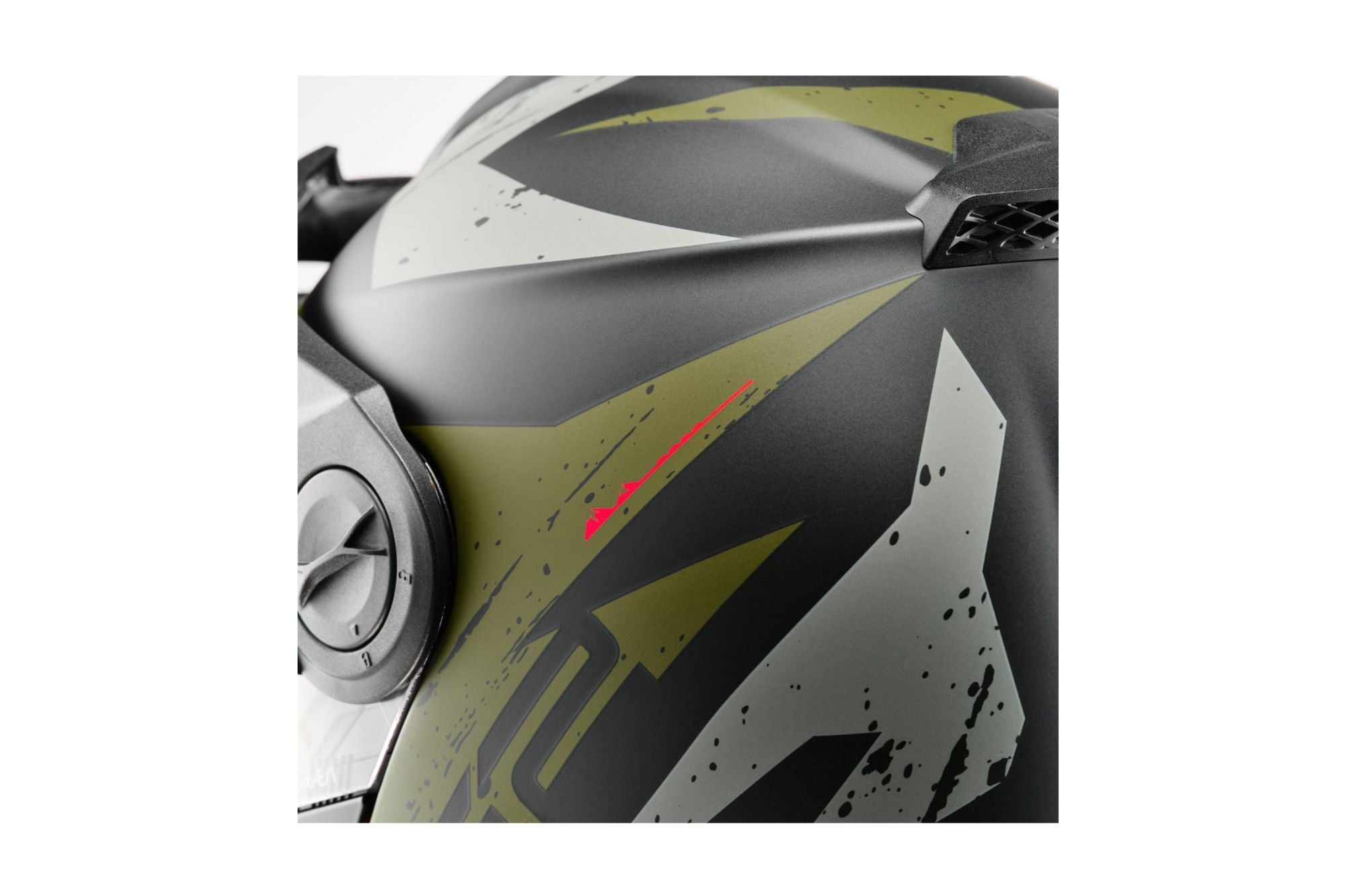 - Nový kšilt prošel testováním ve větrném tunelu, aby minimalizoval vznik vibrací, je nastavitelný do tří poloh a dá se velmi snadno a rychle sundat. Při vyklopení bradové části kšilt zůstává stále ve stejné poloze.
