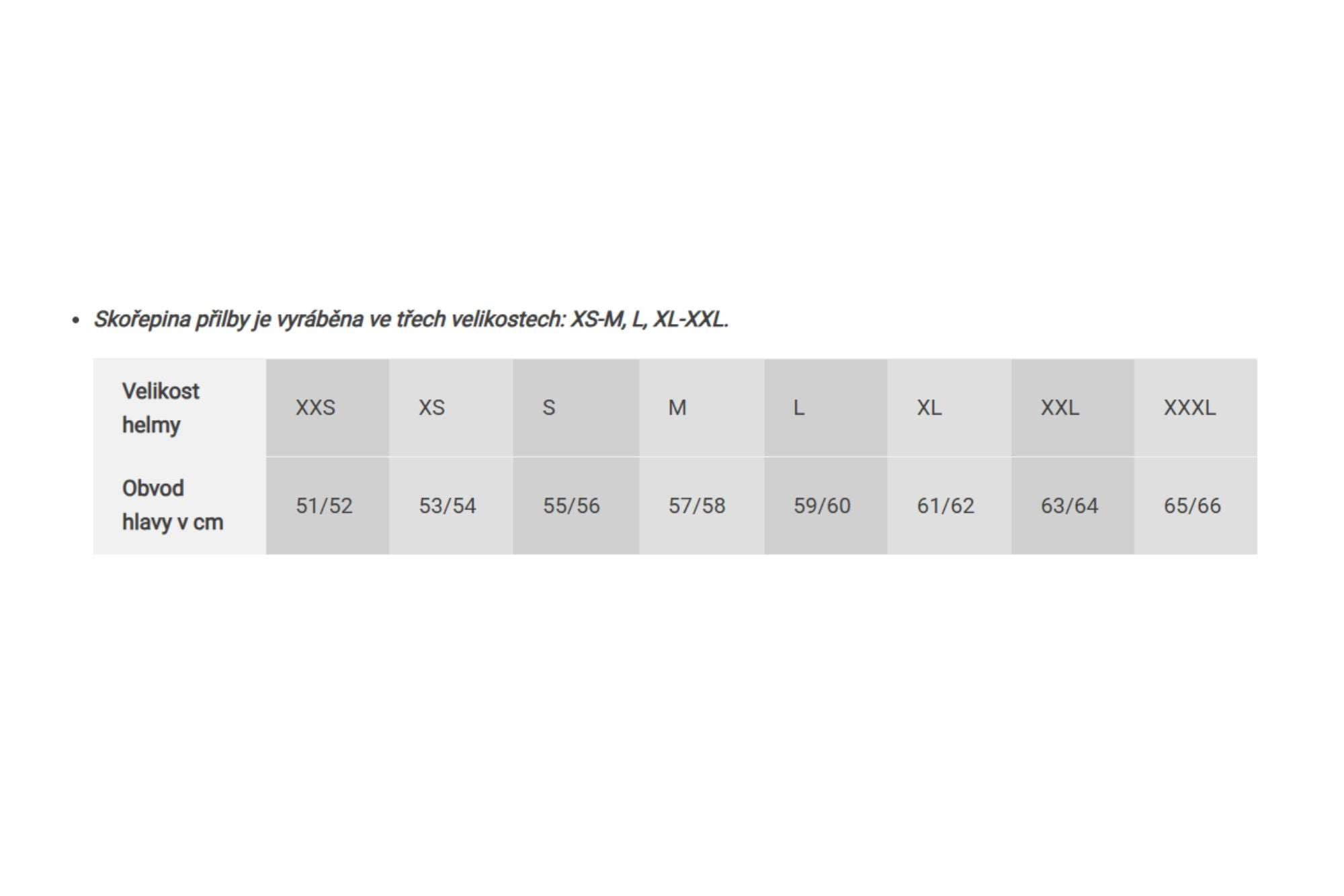 - skořepina přilby je vyráběna ve třech velikostech: XS-M, L, XL-2XL