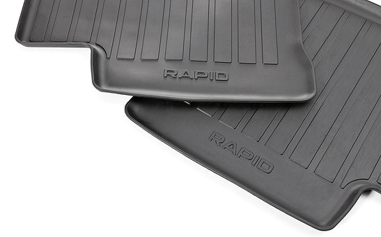 Sada obsahuje dva přední a dva zadní autokoberce s nápisem „Rapid“. Jsou vyrobené z kvalitní pryžové směsi, jejich povrch neklouže a dokonale zachycuje vlhkost i nečistoty. Svým tvarem dokonale vyplňují prostor pod nohama cestujících, čímž dělají interiér vozu mnohem útulnější, a pasažéři si tak užijí pohodlnou jízdu nehledě na počty ujetých kilometrů.