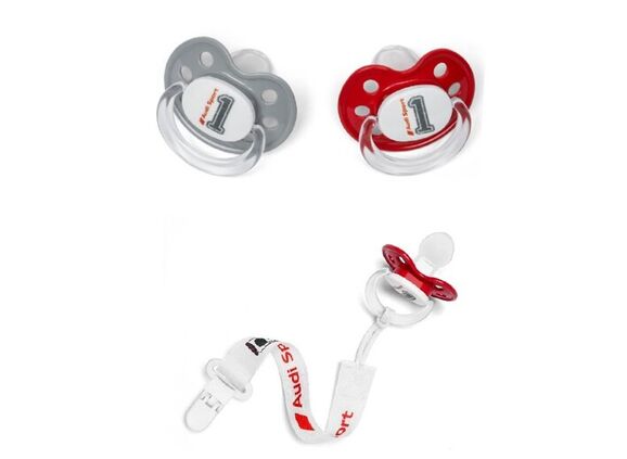 Sada obsahuje 2 kojenecké dudlíky s připínacím páskem se sponou - Šedý a červený kojenecký dudlík, každý s bílou základnou pro uchycení savičky a s průhledným kroužkem - Základna pro uchycení savičky je bílá, přičemž je na ní číslo 1 a logo Audi Sport - Savička je silikonová, zatímco náústek je plastový (polypropylen) - Vyrobeno z materiálů schválených pro použití v potravinářském průmyslu, které neobsahují BPA Materiál: Dudlík: polypropylen (cca 80 %), silikon (cca 20 %), neobsahuje BPA Připínací pásek: 100 % polyester