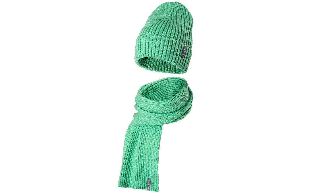 Pletený set čepice a šála v barvě electric green. Hrubě pletený vzor. Tkaný label v šedé barvě přes okraj s logem Škoda. Délka šály 165 x 25 cm.