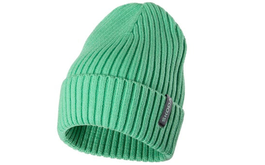 Pletený set čepice a šála v barvě electric green. Hrubě pletený vzor. Tkaný label v šedé barvě přes okraj s logem Škoda