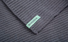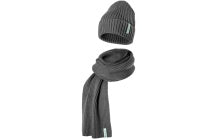 Pletený set čepice a šála šedý. Hrubě pletený vzor. Tkaný label v barvě electric green přes okraj s logem Škoda. Délka šály 165 x 25 cm.