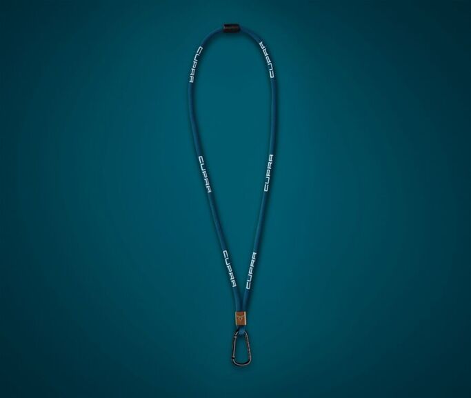 Šňůrka ze silné kulaté šňůry v petrolejově modré barvě s nápisy CUPRA v bílé barvě. Měděná spona s laserovým symbolem CUPRA (obrázková značka), černá karabina se slovem CUPRA a bezpečnostní spona. Délka: 50 cm Materiál: Polyester