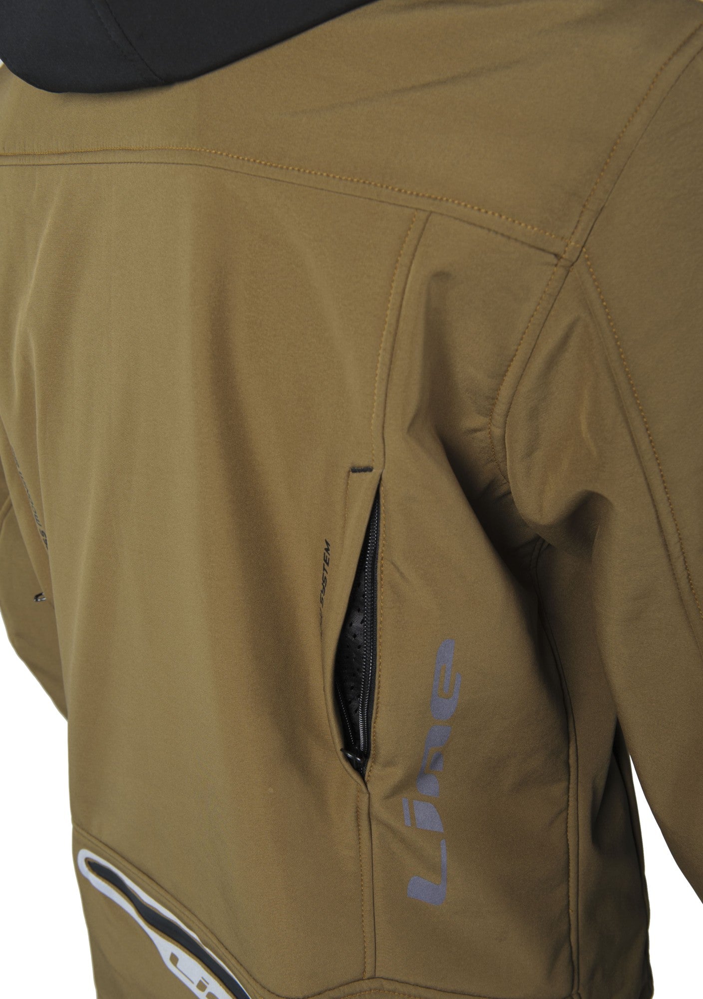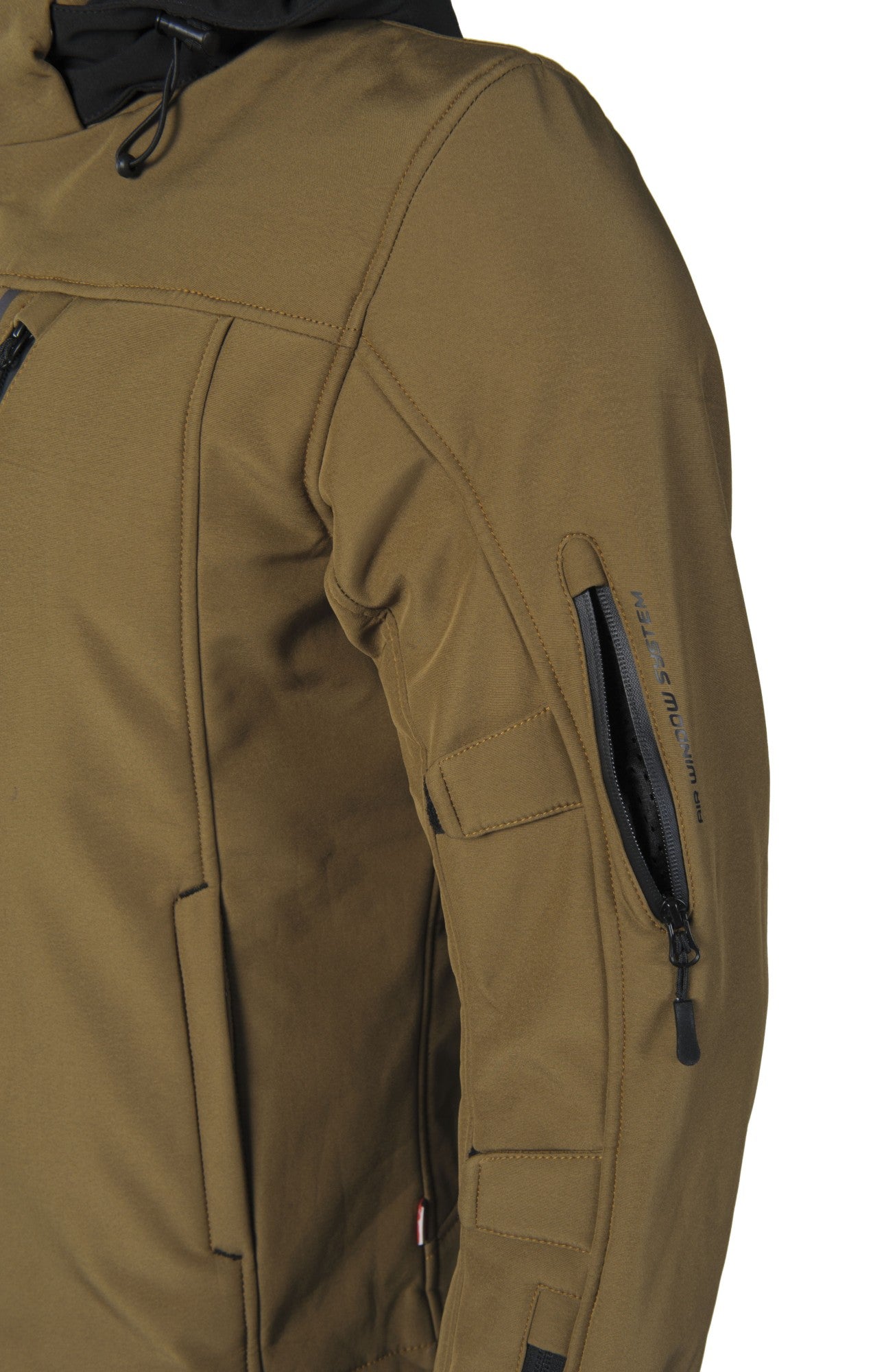 Softshellová hnědá bunda s kapucí, vyjímatelné CE chrániče na loktech a ramenech.