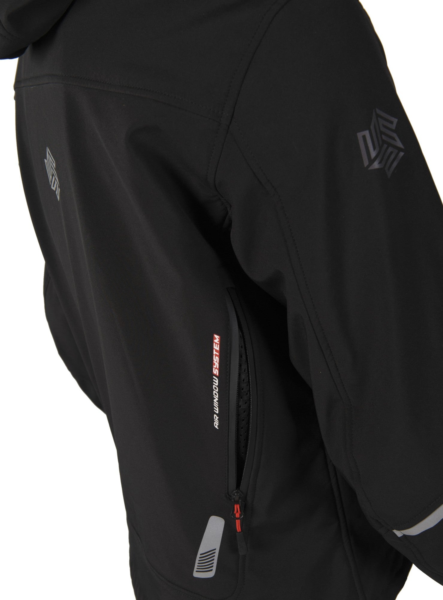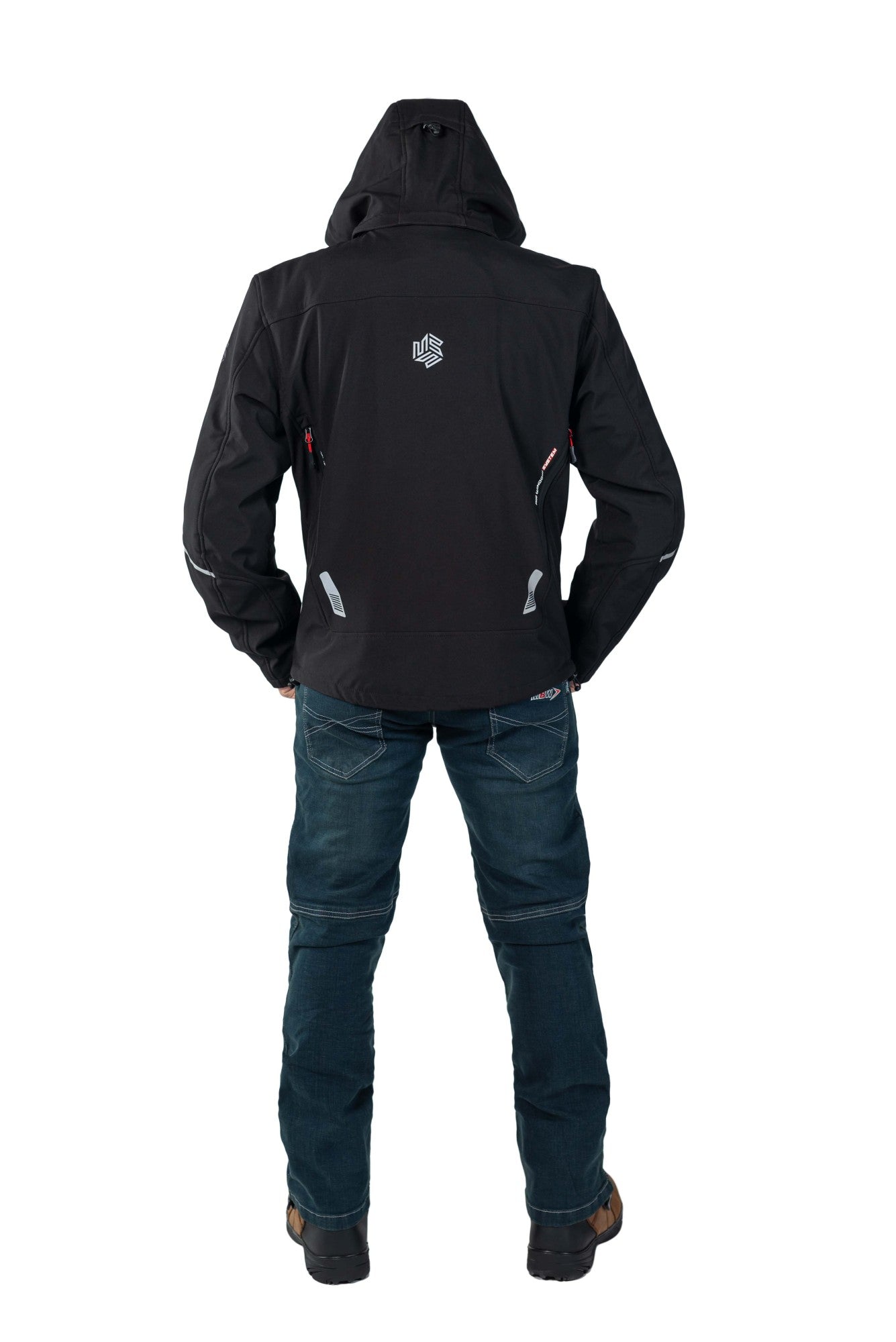 Softshellová bunda s kapucí, vyjímatelné CE chrániče na loktech a ramenech.