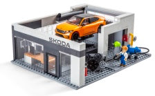 Stavebnice servisní stanice a modelu vozu Enyaq Coupé RS v oranžové barvě. Měřítko 1:35. Nevhodné pro děti do 3 let.