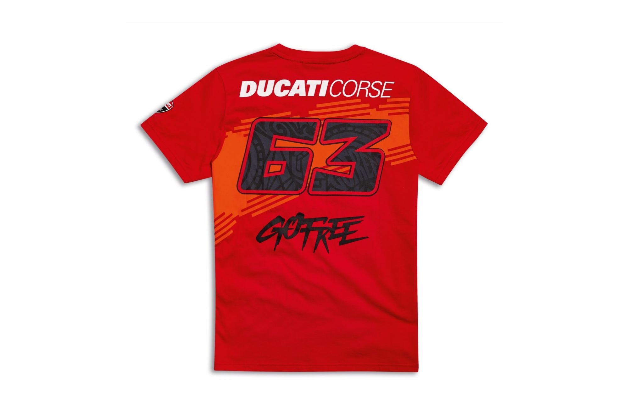 Tričko Dual Pecco s velmi nápadnými barvami s ikonickými detaily, s logem Ducati Corse a číslem jezdce. S mottem "Go Free" na zadní straně coby pocta trojnásobnému mistru světa týmu Ducati Lenovo Team.